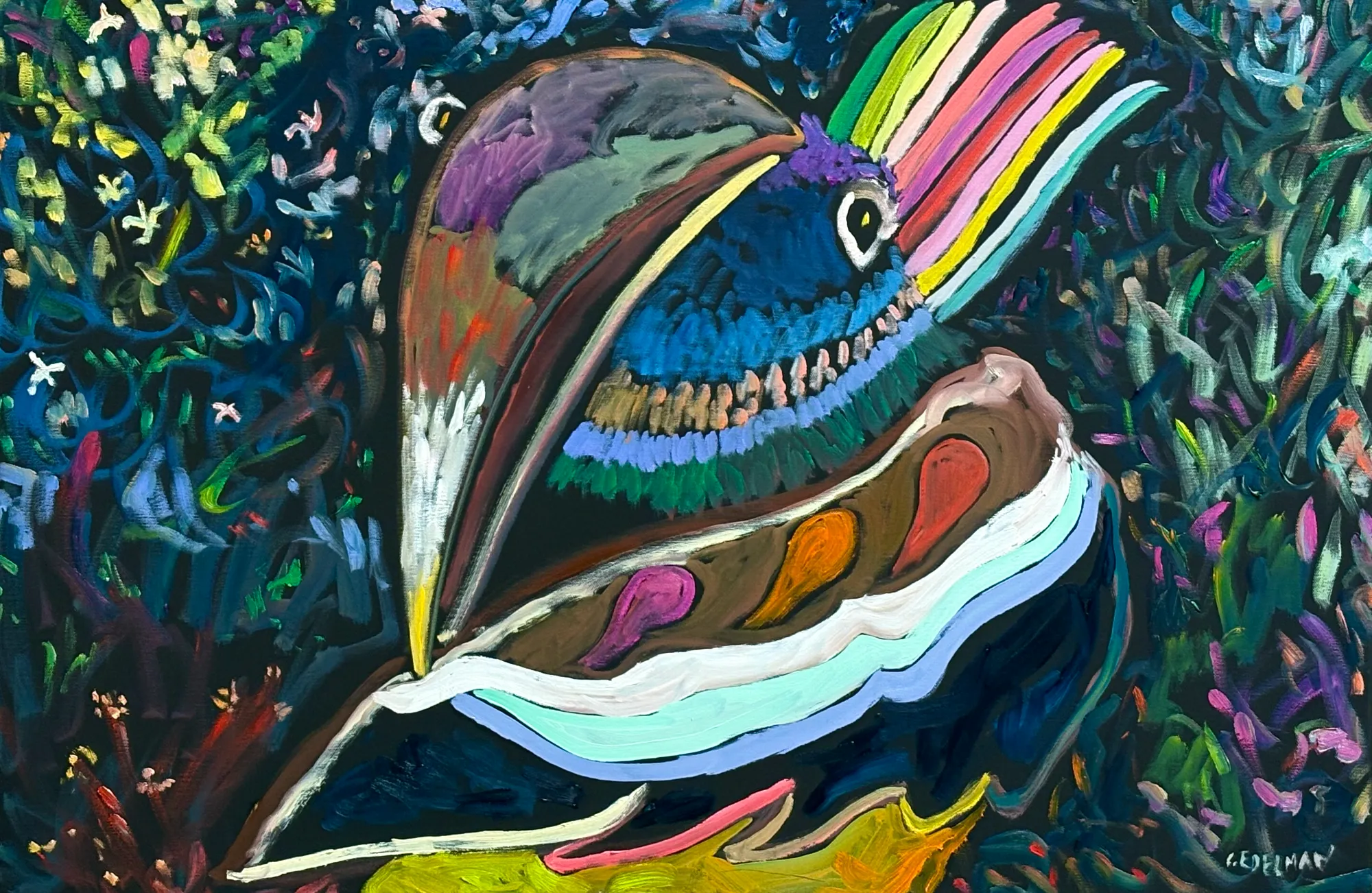 So what animals have captivated your imagination on how many trips to zoos ?And let us step a little even deeper in the jungle perhaps ? So how would you present it as a work of art , and I don't mean to recreate a photograph either . Close your eyes and take a journey with some of the most intense color vibrations imaginable please. Birds have fascinated me as I have experienced giant condors swooping down a foot over my head and experienced so much inspiration from occasionally releasing a pair of tiny finches in my house years ago. You get the picture and you can actually own this picture as I will pay shipping and taxes in the US and the price is a steal at $2400 for this , and I won't even mention some of the gorgeous abstract shapes in this proud one of the jungle. Will I ???? HEHA Acrylic and acrylic Marker on a black canvas with great subtlety on the shadows.