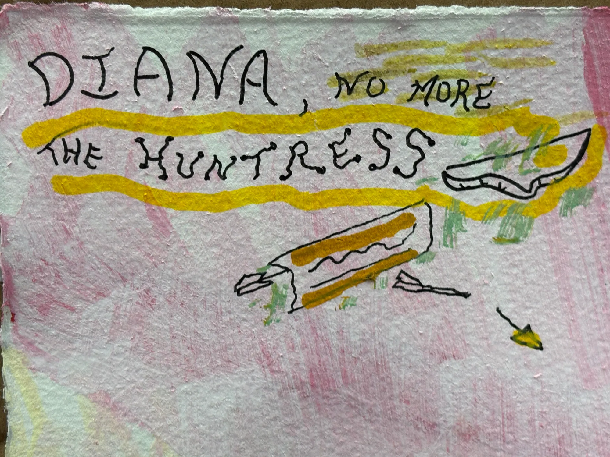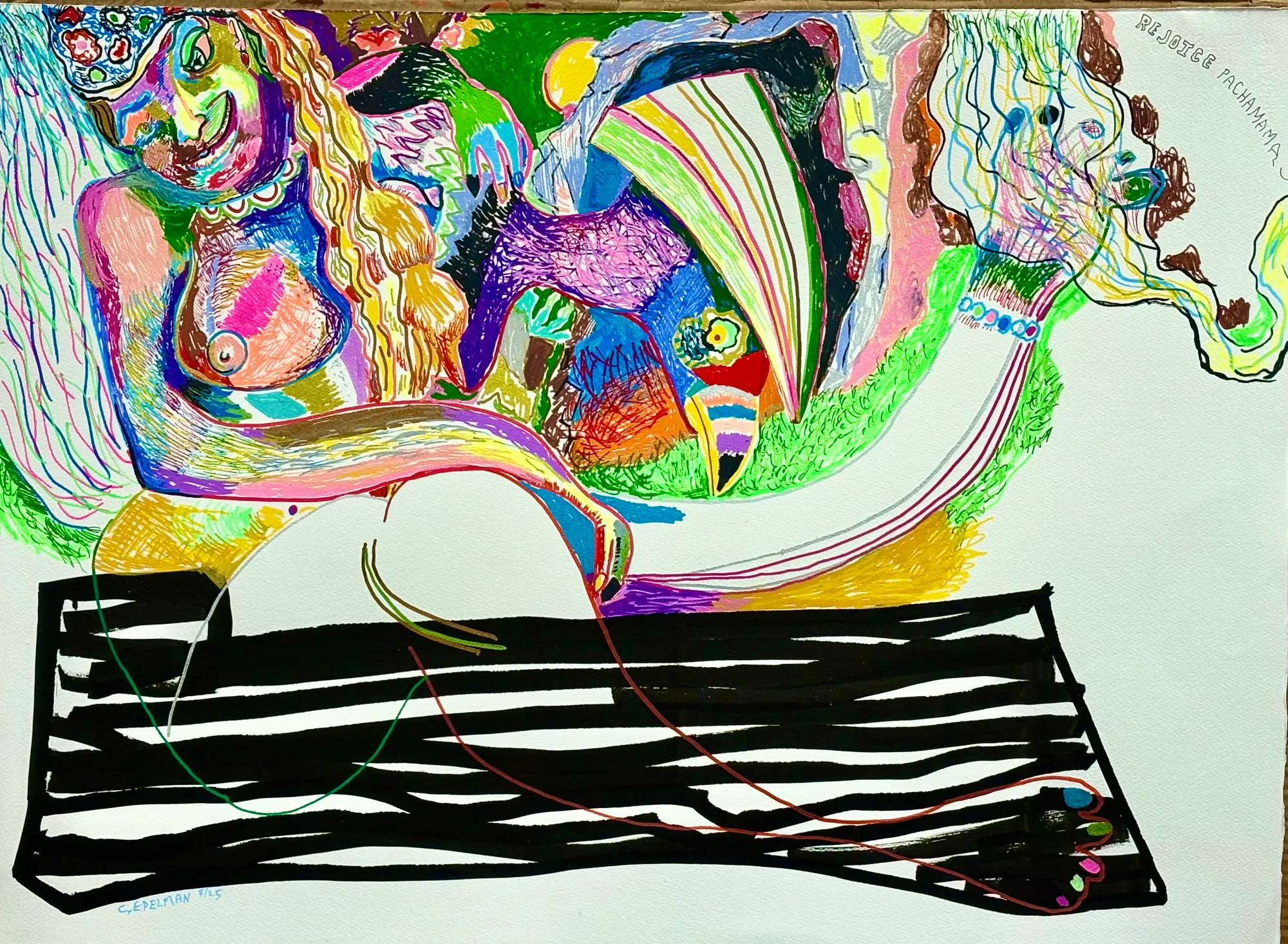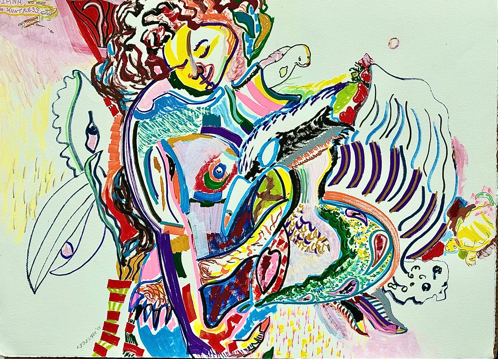 The Earth Mother Pachamama relaxes in the spring. Diana the newfound pacifist surrenders her bow and arrows. Mixed media using mainly acrylic markers on Fabriano paper. Sprayed with a UV Archival Fixative and I suggest framing with UV glass and no direct sunlight. $1300 and I will pay taxes and shipping.,