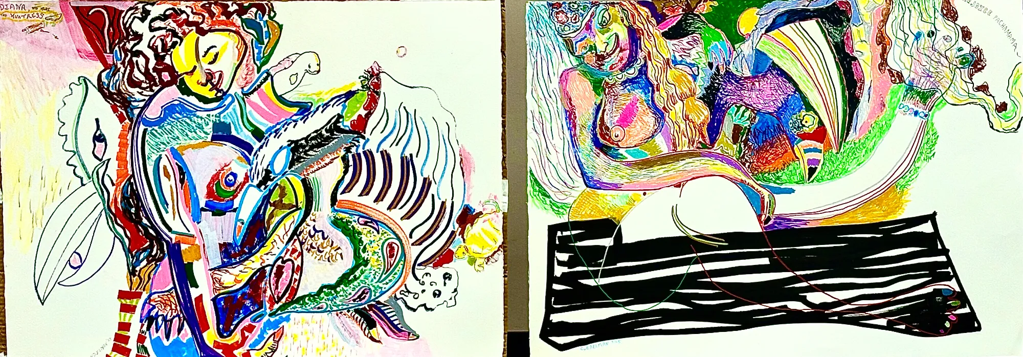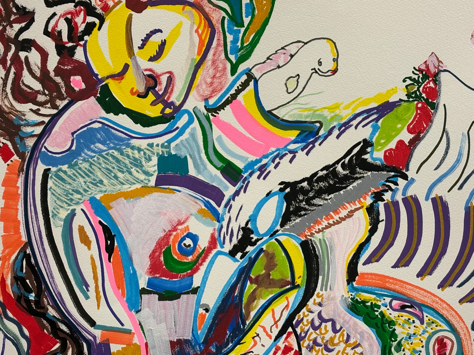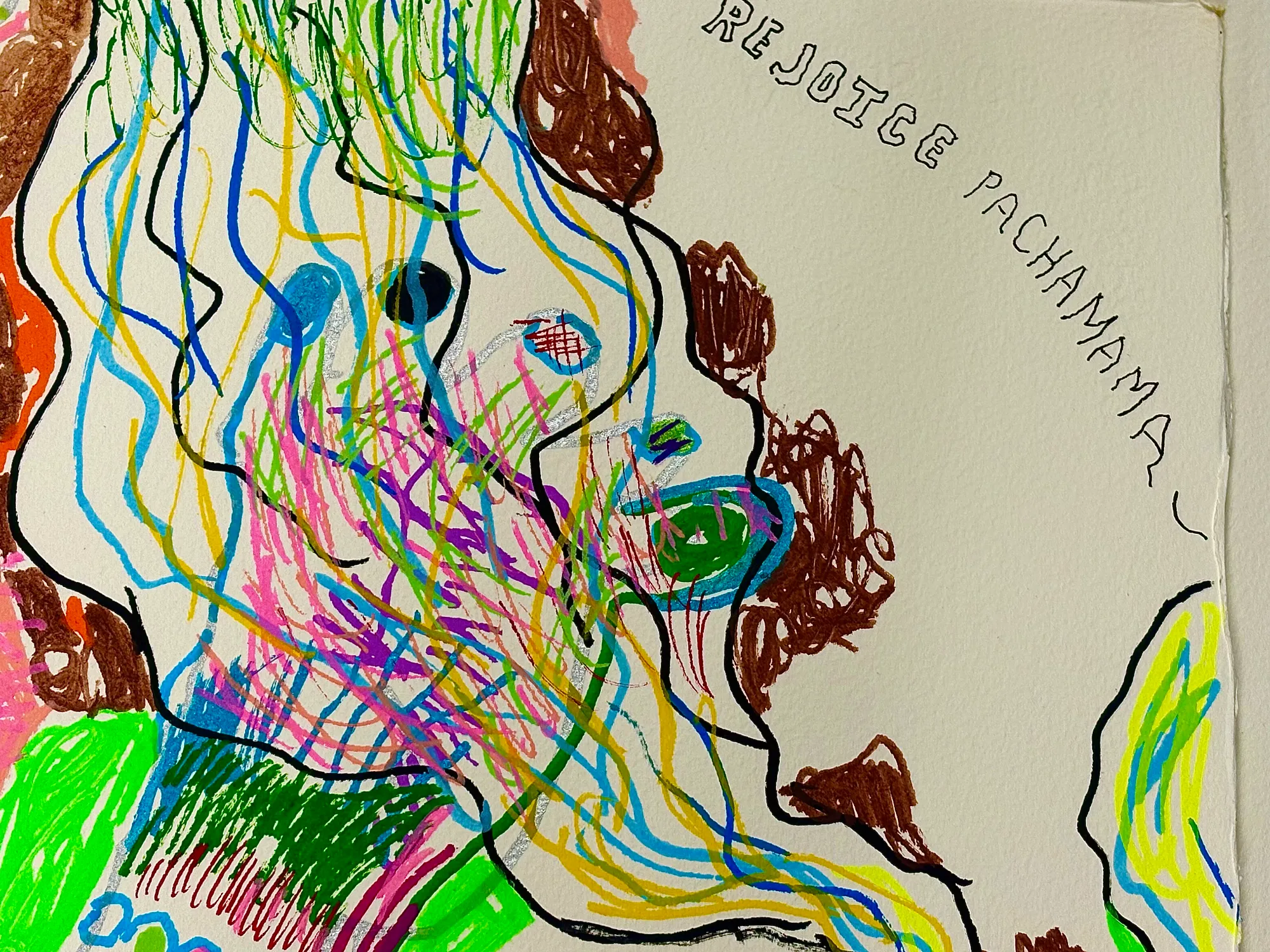 The Earth Mother Pachamama relaxes in the spring. Diana the newfound pacifist surrenders her bow and arrows. Mixed media using mainly acrylic markers on Fabriano paper. Sprayed with a UV Archival Fixative and I suggest framing with UV glass and no direct sunlight. $1300 and I will pay taxes and shipping.,