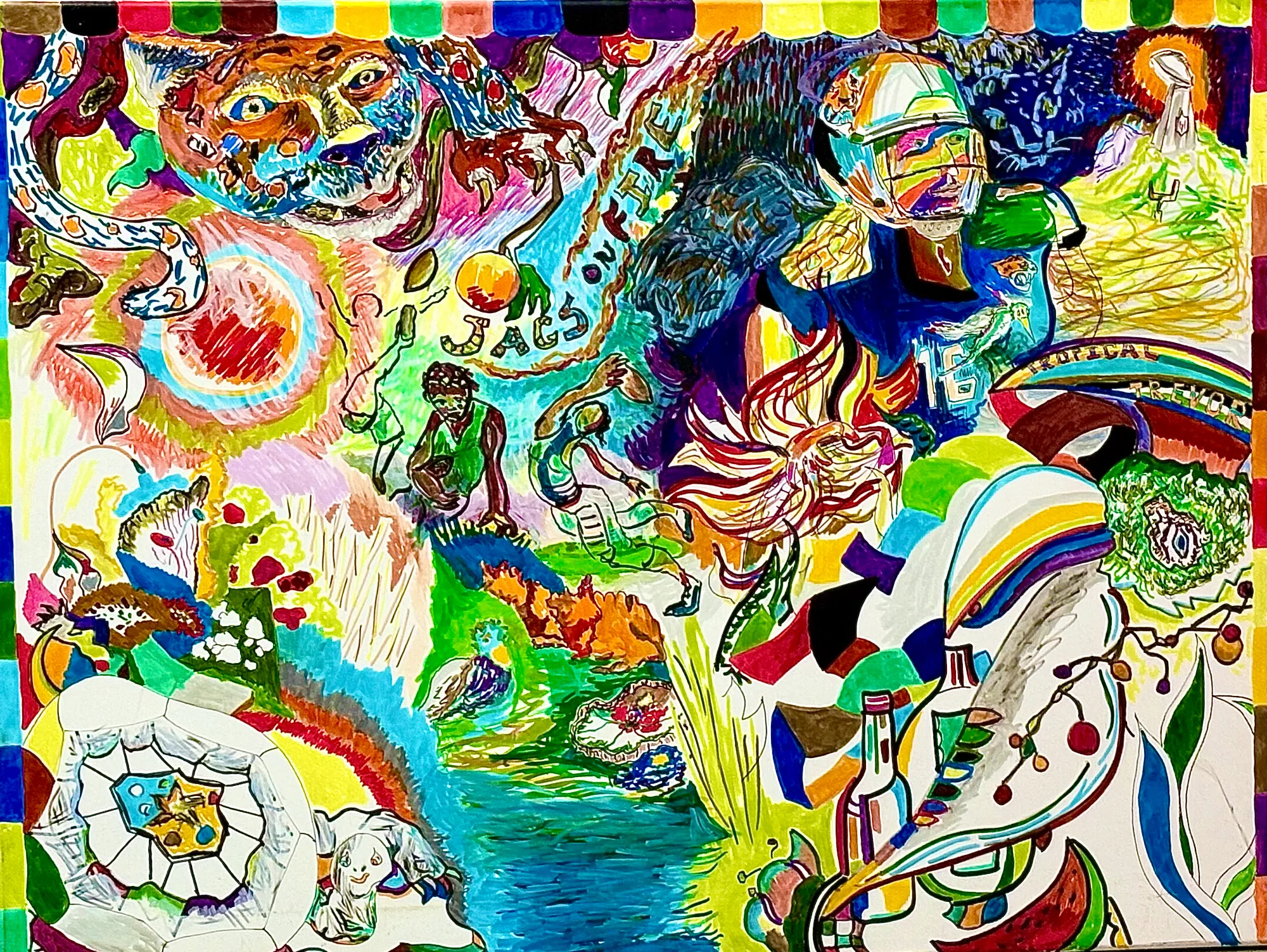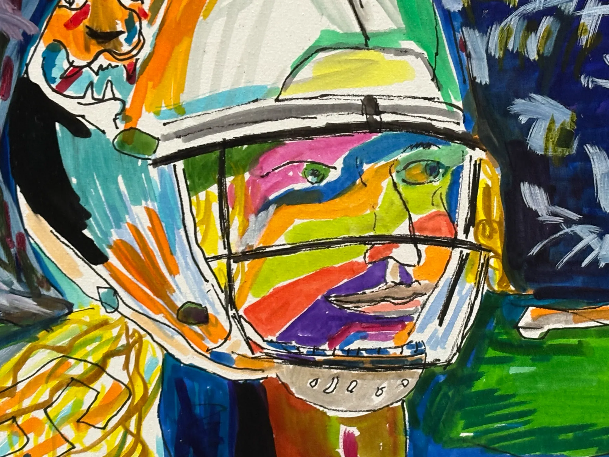 This a mixed media work that combines elements of watercolor with the boldness of acrylic markers on a stretched primed canvas. Sometimes sports needs to have a bit of a sense of humor and since I won't mention everything here ,and there is a ton for sure ,please watch this unfold in your home in a great armchair and imbibe away !!!LOL This has been sprayed with several coats of the finest UV Archival Fixative and I suggest framing with UV Glass and no direct sunlight too. I will pay taxes and shipping in the US and would love this to hang in the home of a paradise lover and football fan too, and who isn't that . There is an article on the website here about my structure for pricing as I have sold work for thousands yet want it to be within reach for as this work can fill your life with even more joy . The price is $2200 ,a terrific deal in my opinion as this receives terrific comments all of the time.