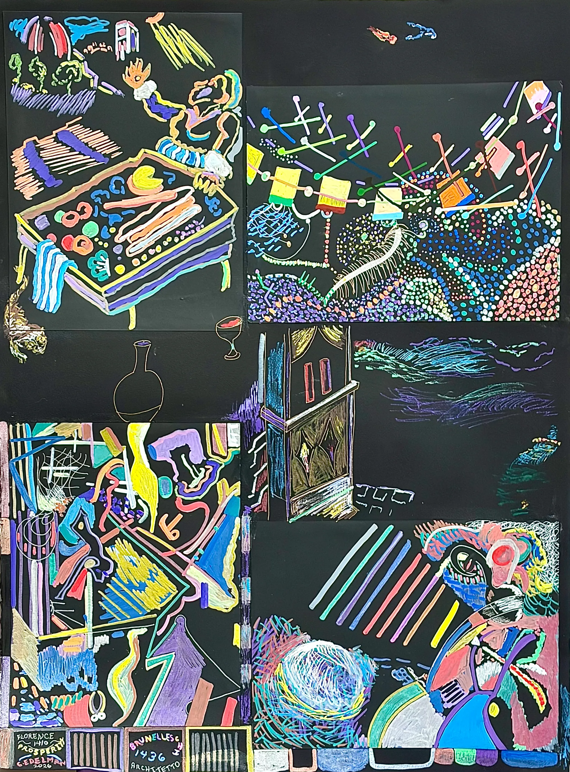 Travels with a spiritual bent hastens what images for you personally ? Florence for myself as I spent many days wandering the streets discovering places to draw or paint at 5:30 AM every day ,while being totally enthralled until 8 PM in the evening. My pals were sipping great vino on the veranda yet after a glass I could not wait to wake up early that next morning. This Duomo holds a special place in my heart after finding secluded spots to paint my watercolors and pen and ink work and that wasn't easy ! How architecture is and was built fascinates me so no matter how simple or complex a work of mine may appear I strive for the underlying unity without any preconceived conceptions exactly like the jazz musician Miles Davis felt in whatever musical realm that he set his mind to. In reading in depth about Brunelleschi I had to include the prosperity of the region by showing a street food vender receiving a gold florin in this joyous celebration from the heavens ,plus the abstraction of all the elements that produced this marvel through the kinetic energy that I imagined . Personally I was shocked at the sureness and certainty of the lines and felt as if I was a master captivated by the uniqueness of the unfolding spectacle. A time traveler knows no limits ! ******Acrylic and ink on fine medium weight paper and I frame mine with UV Museum Glass and no direct sunlight also ,except they are supposed to be extremely lightfast here.****** Display how you wish and I will pay shipping and taxes in the US.. Grazie to the 15 th Century too, Charles